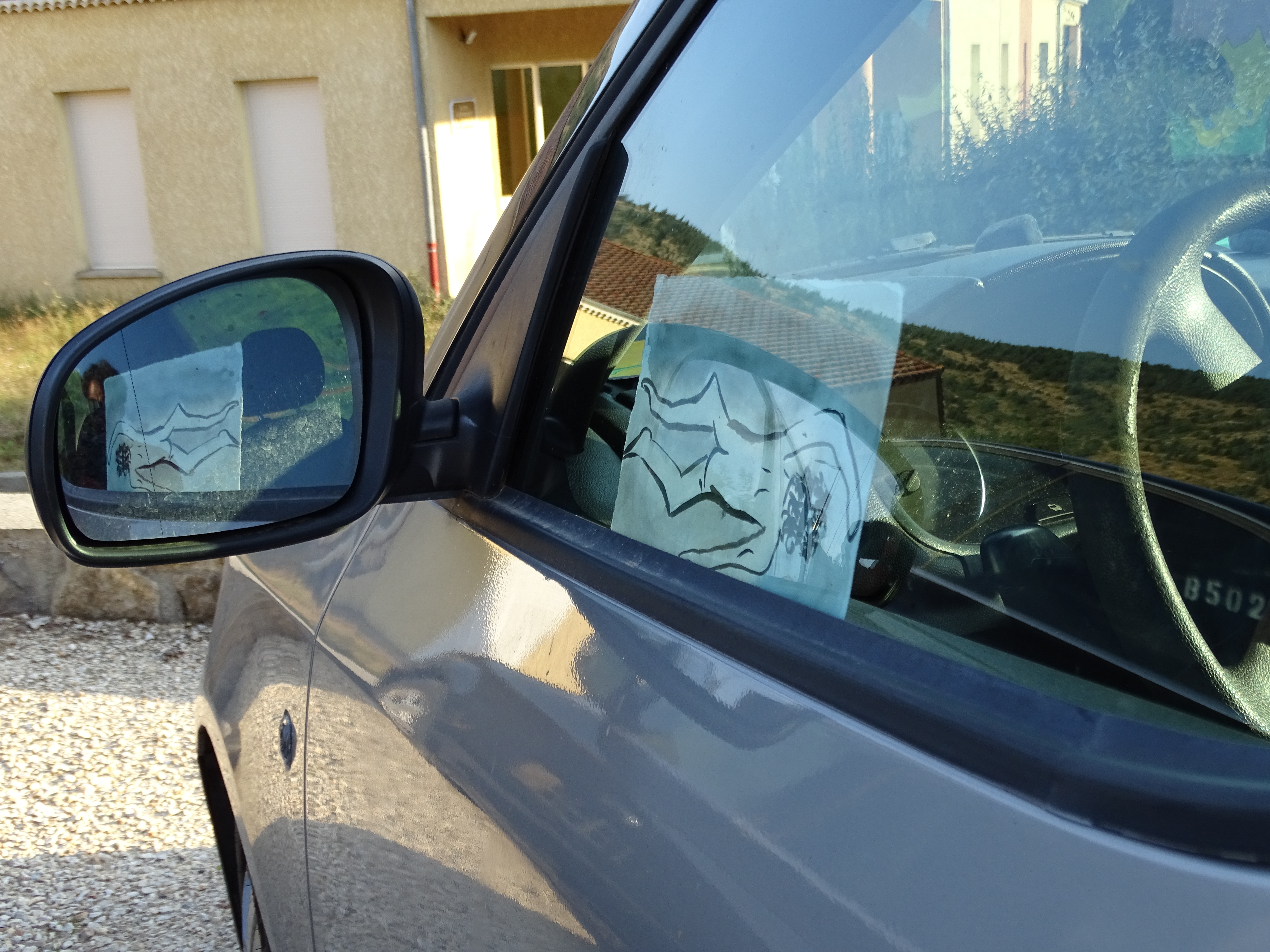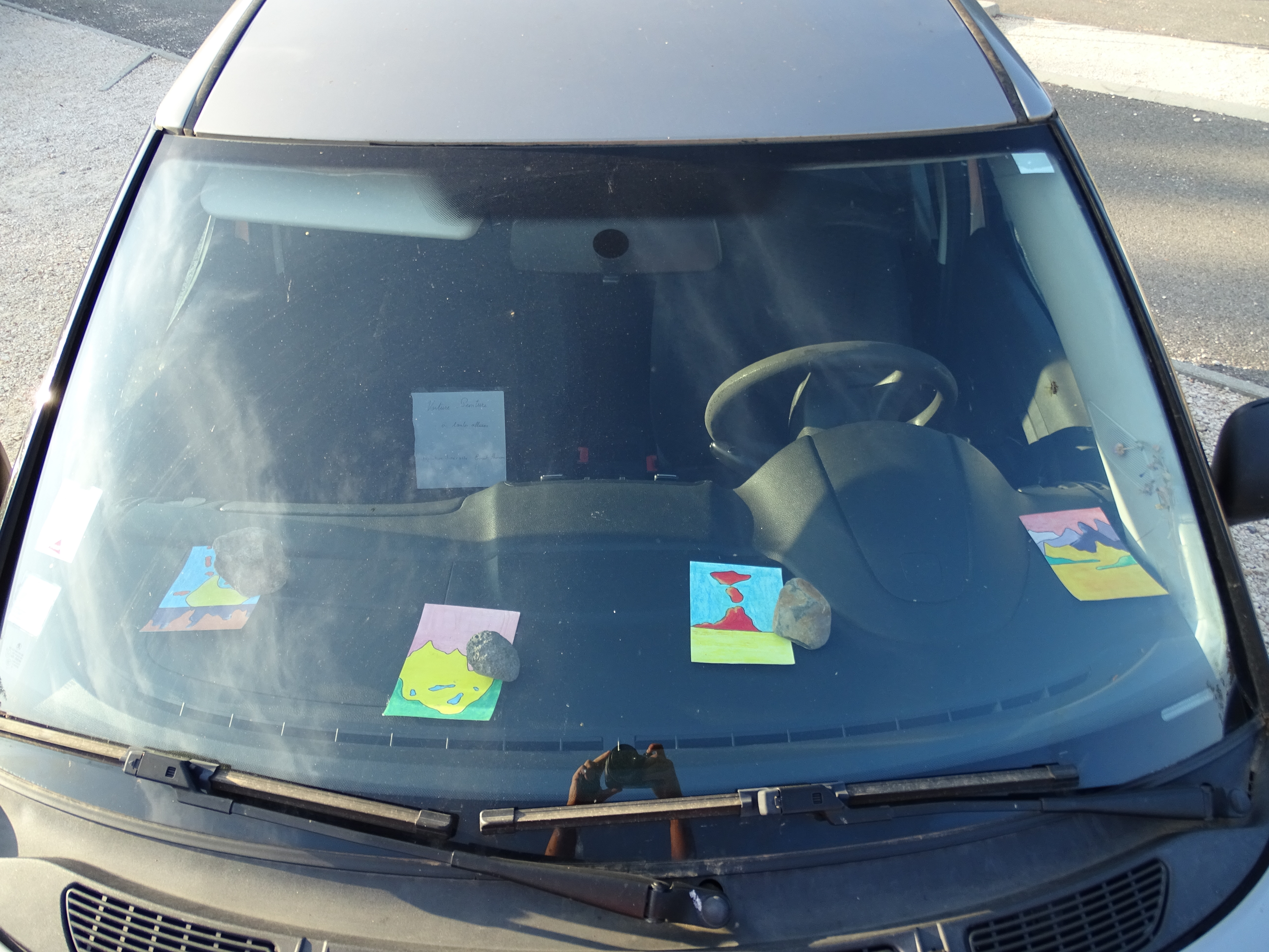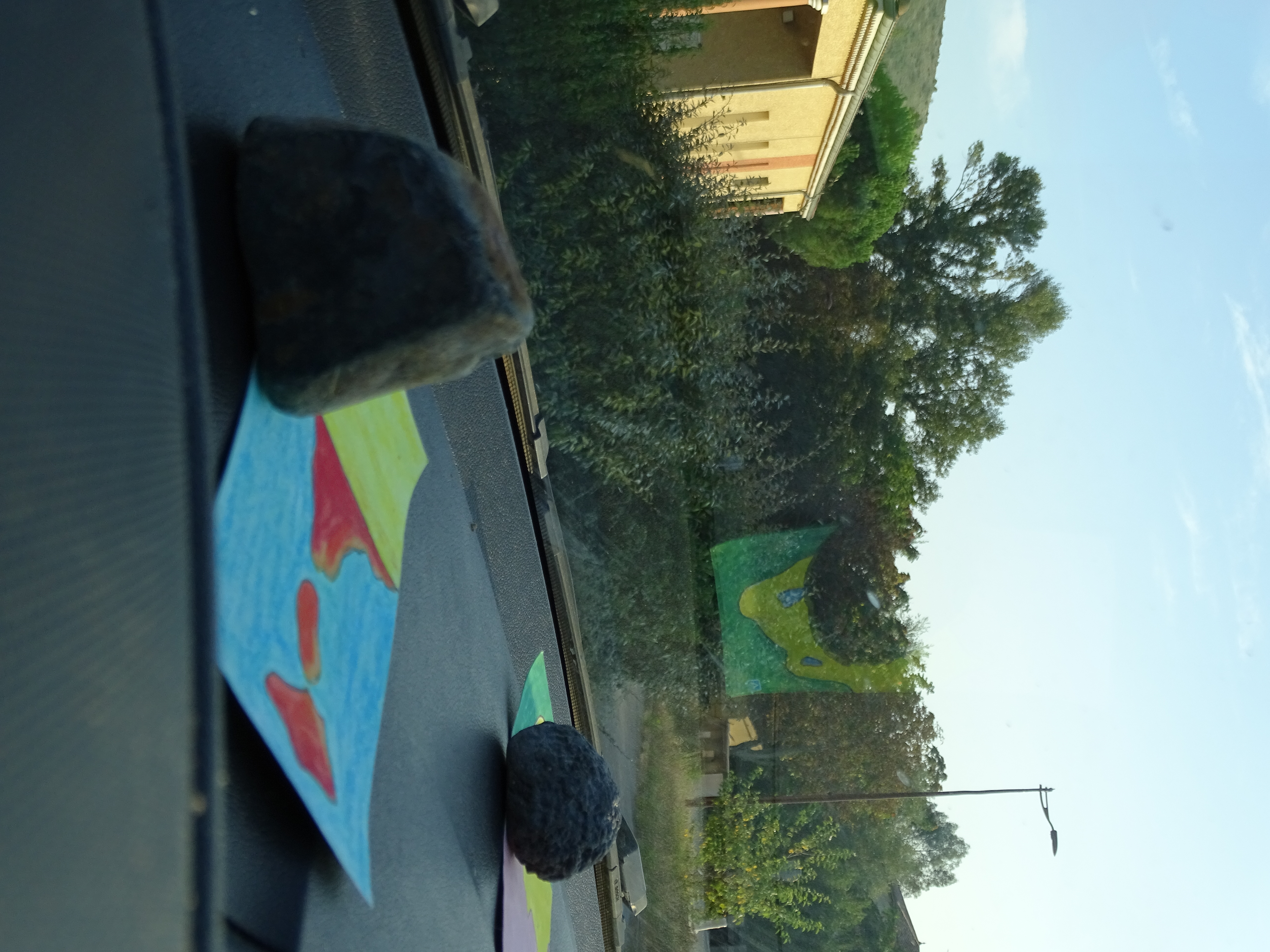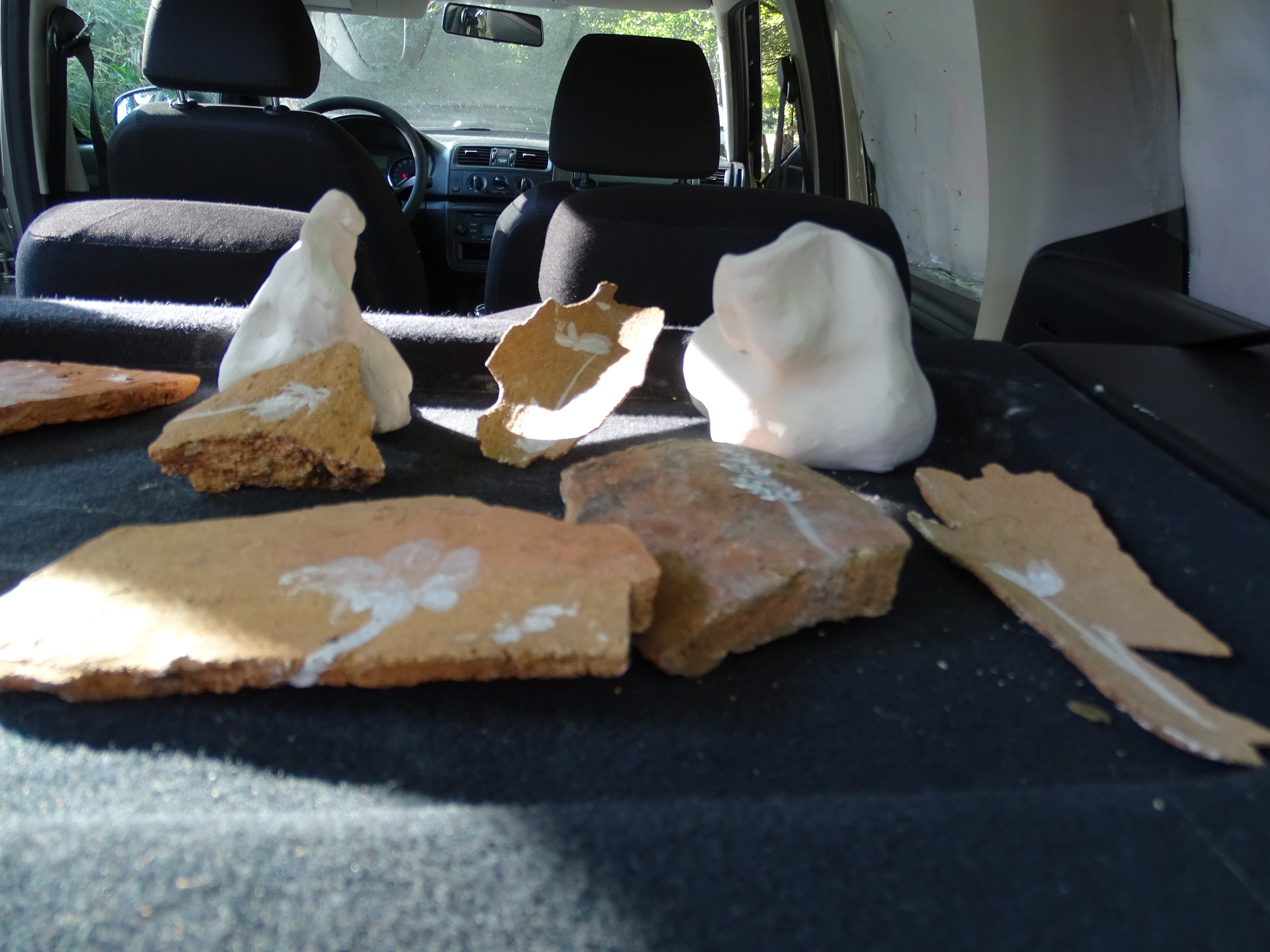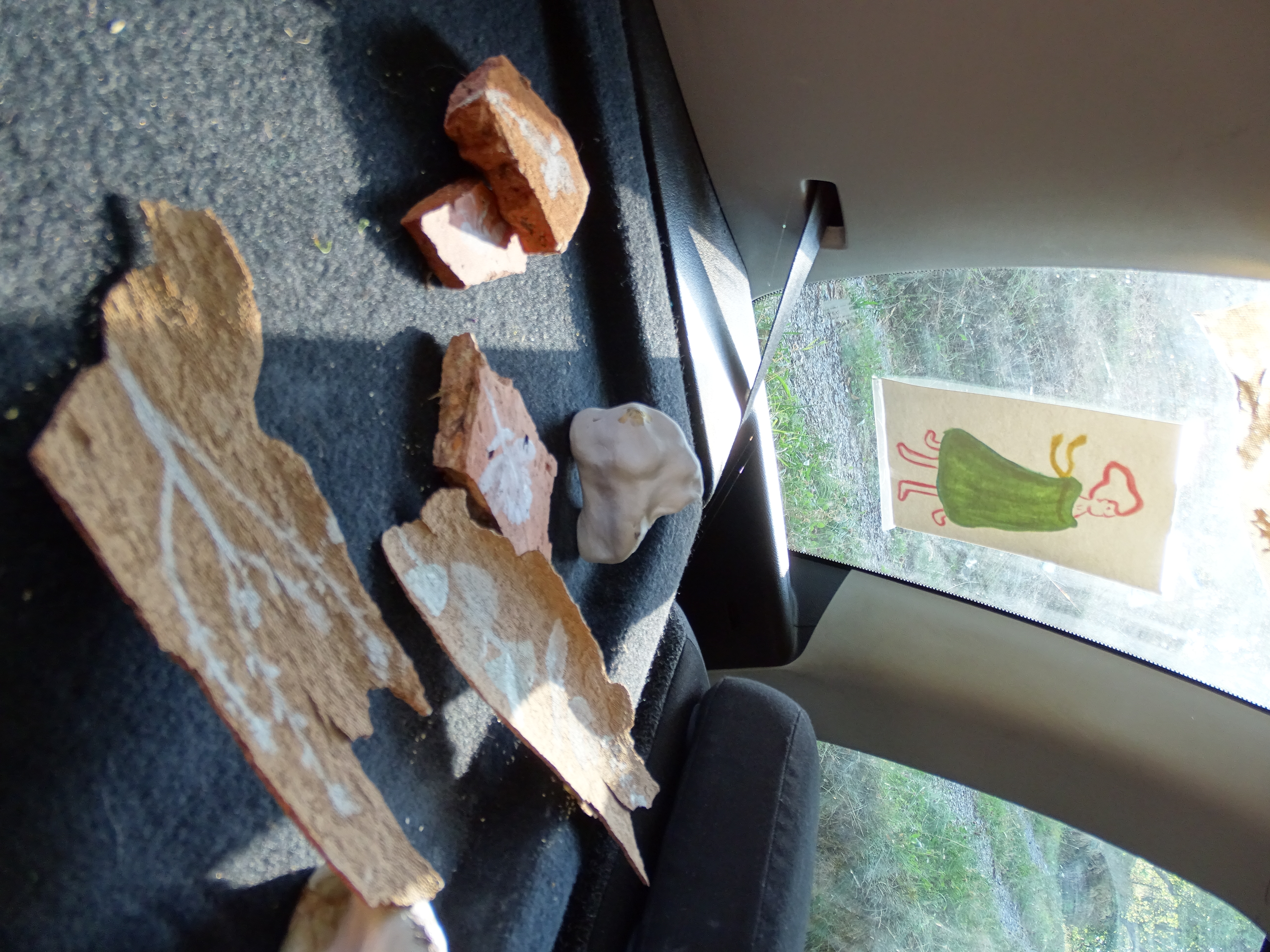 Peinture de fleures sur écorce et fragment de tuiles. Installation sur plage arrière avec volumes en argiles rehaussé de fleures séchées.