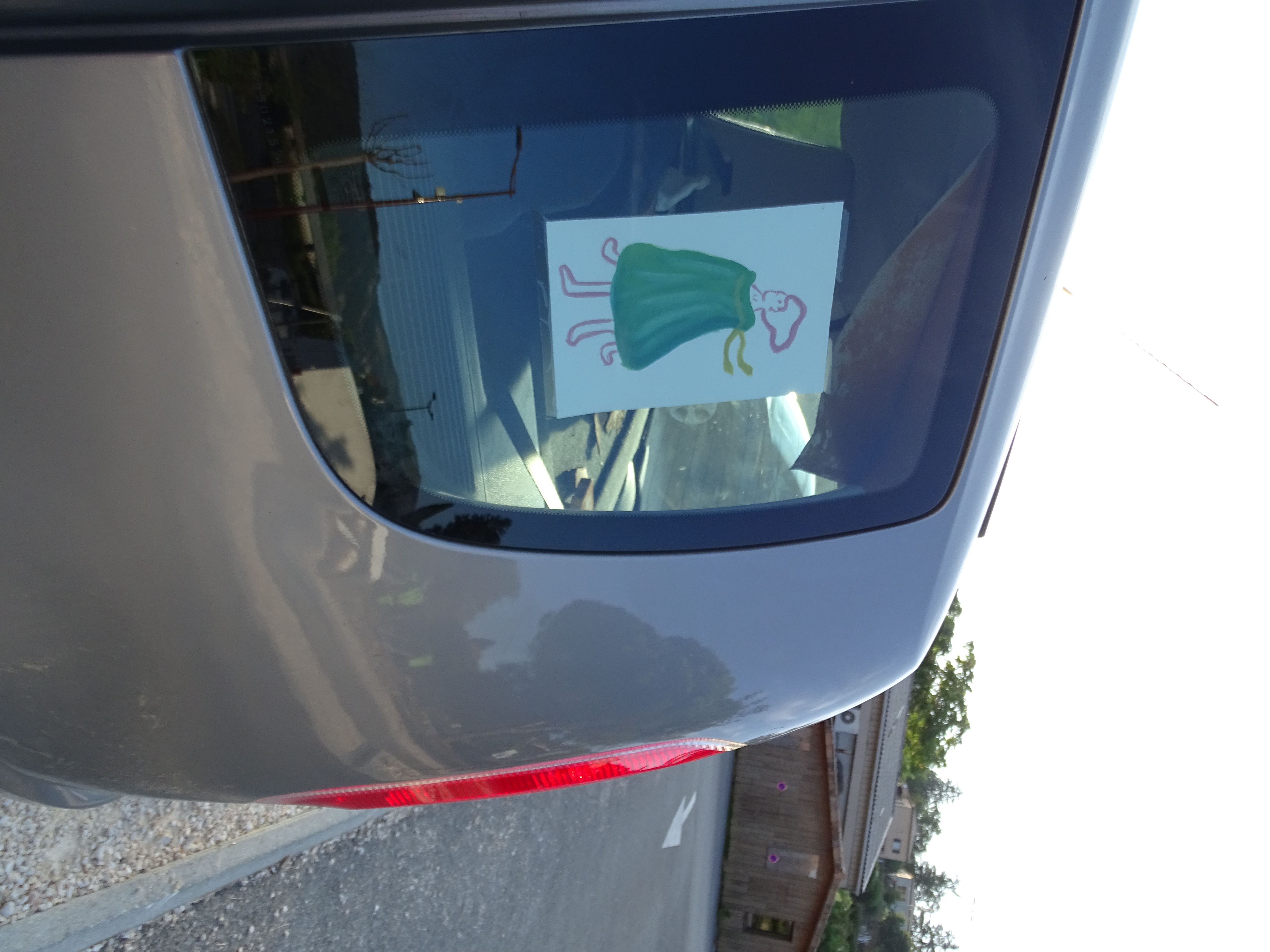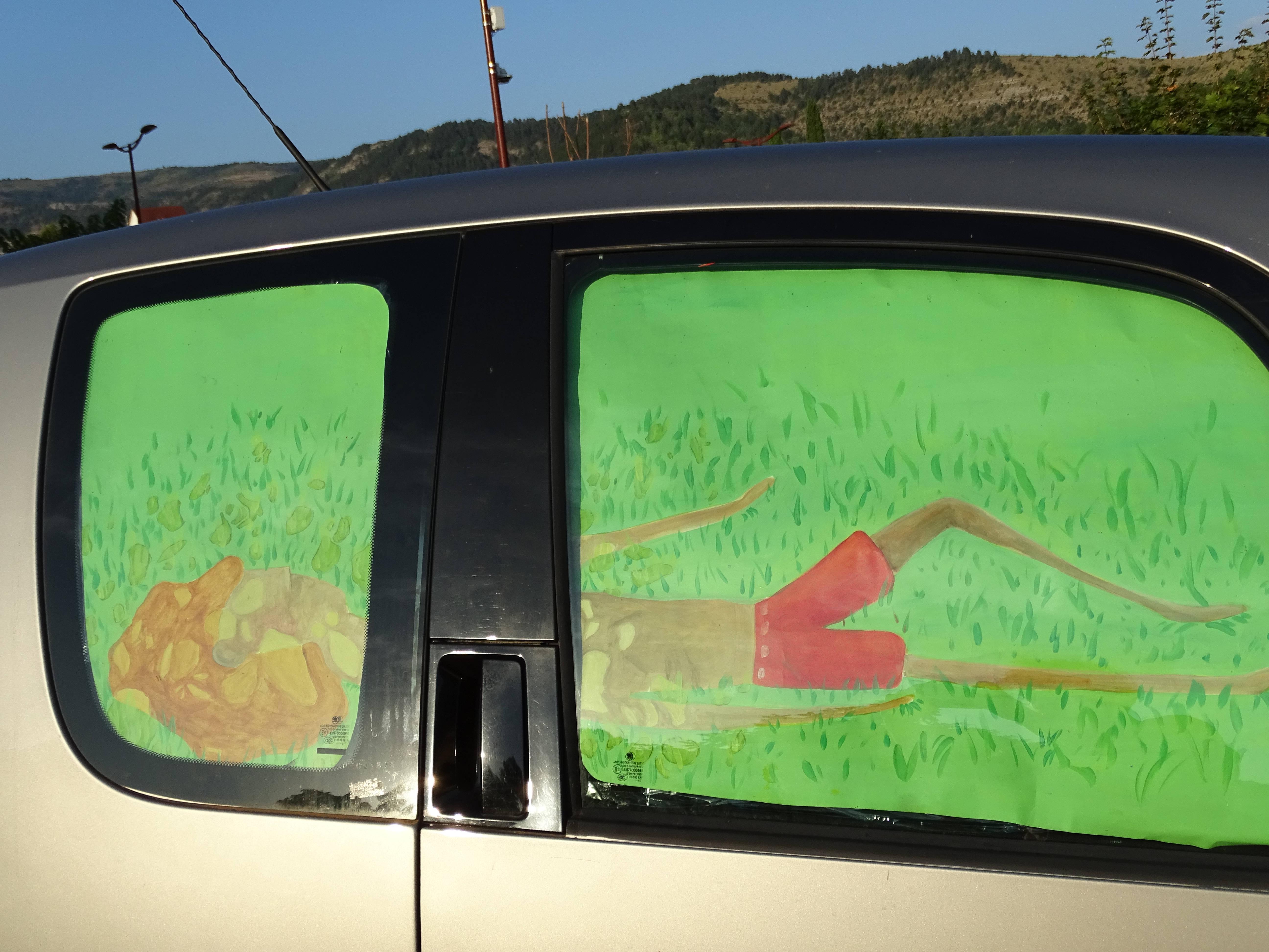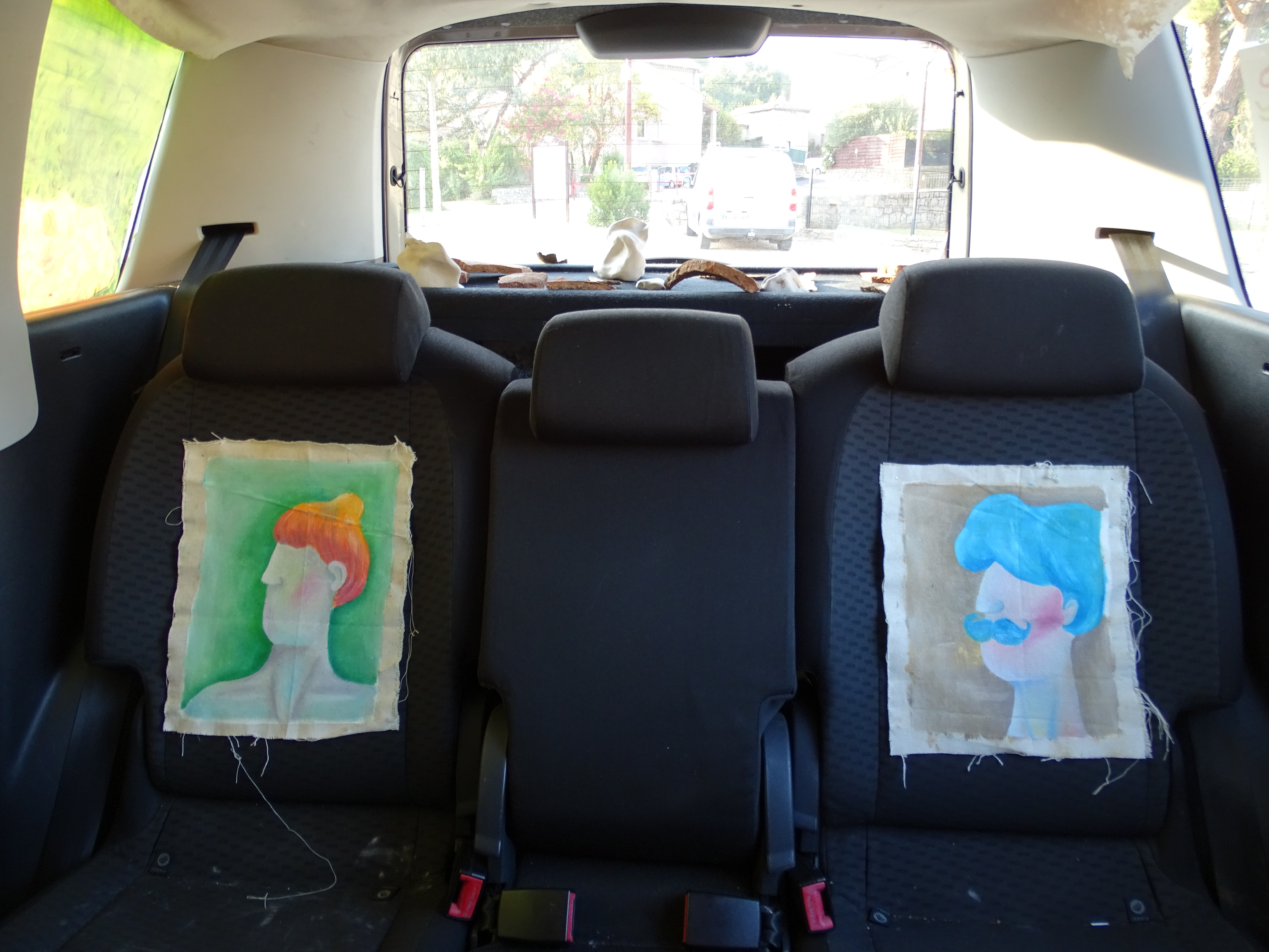 2 portraits à l'huile sur toile libre sont accrocher sur les sièges arrière comme des passagèr.e;s de voiture-peinture.