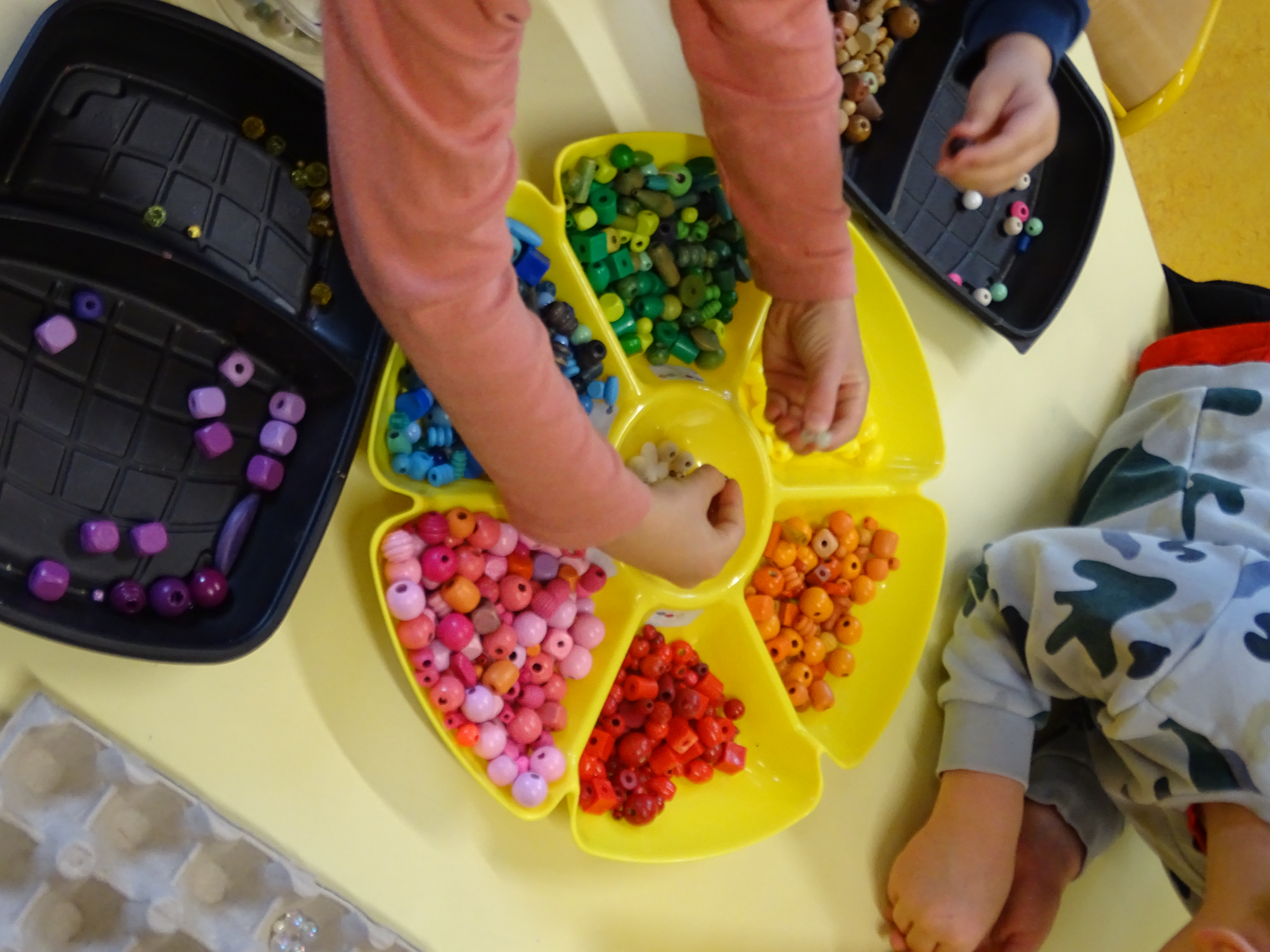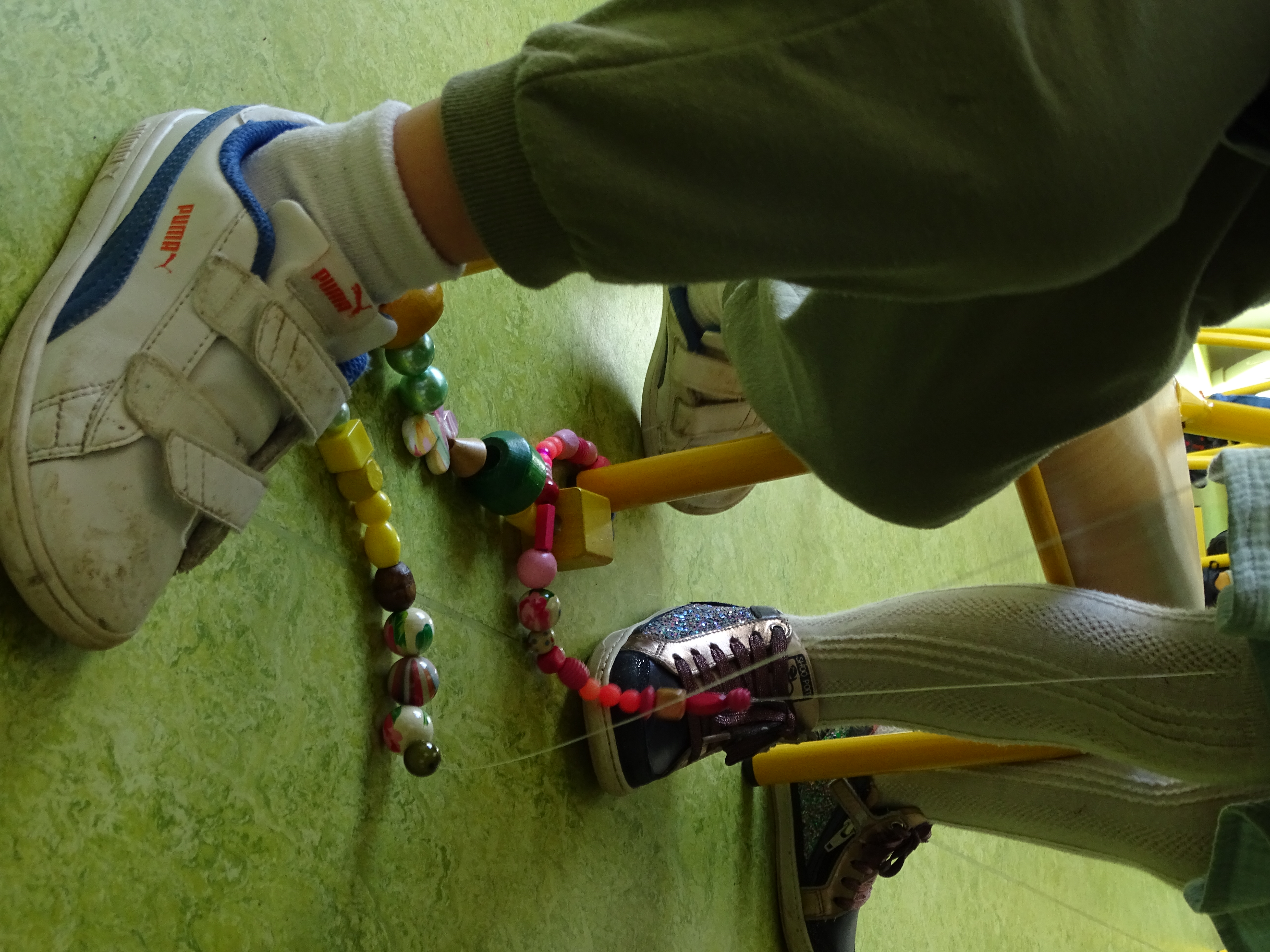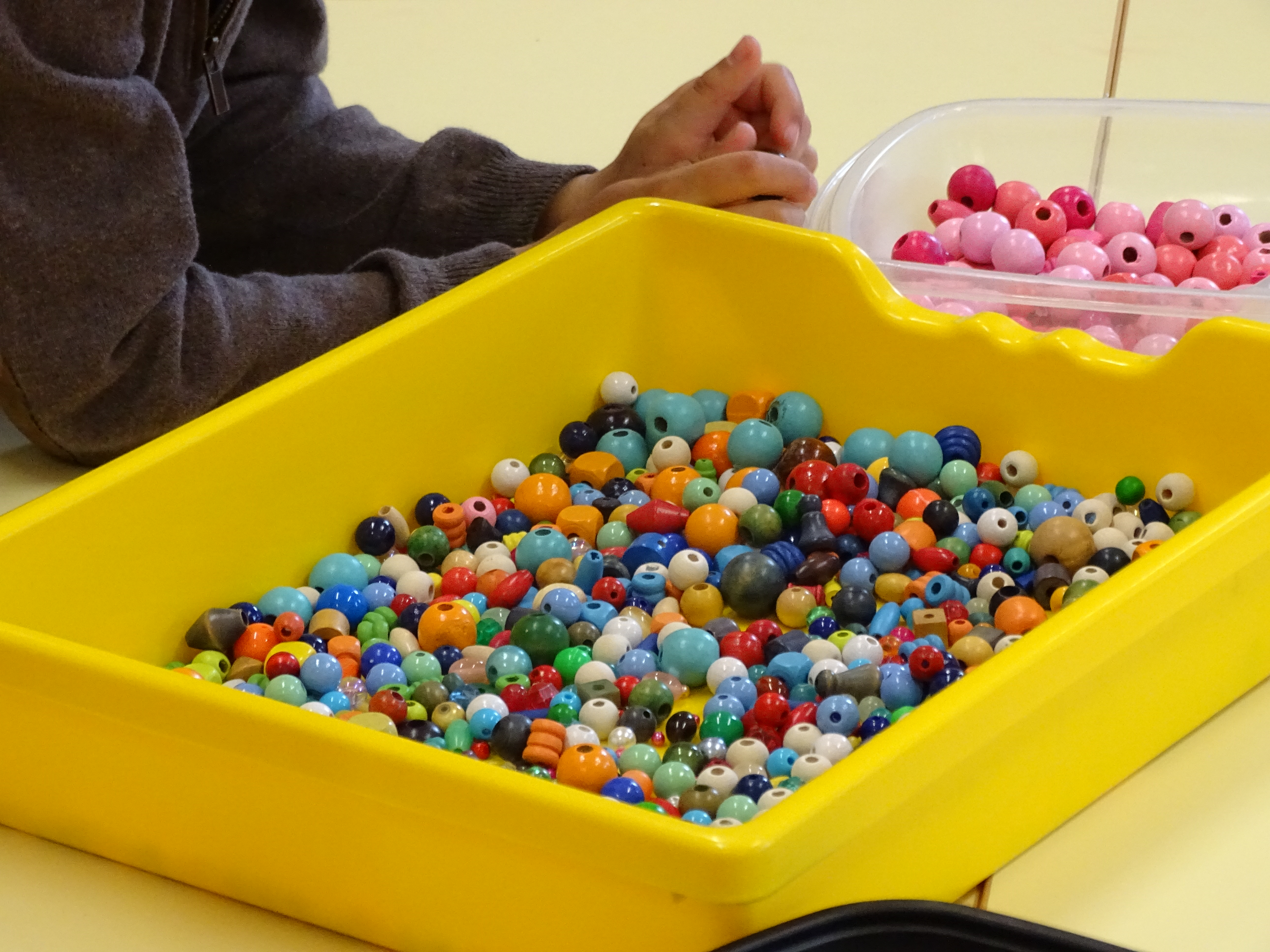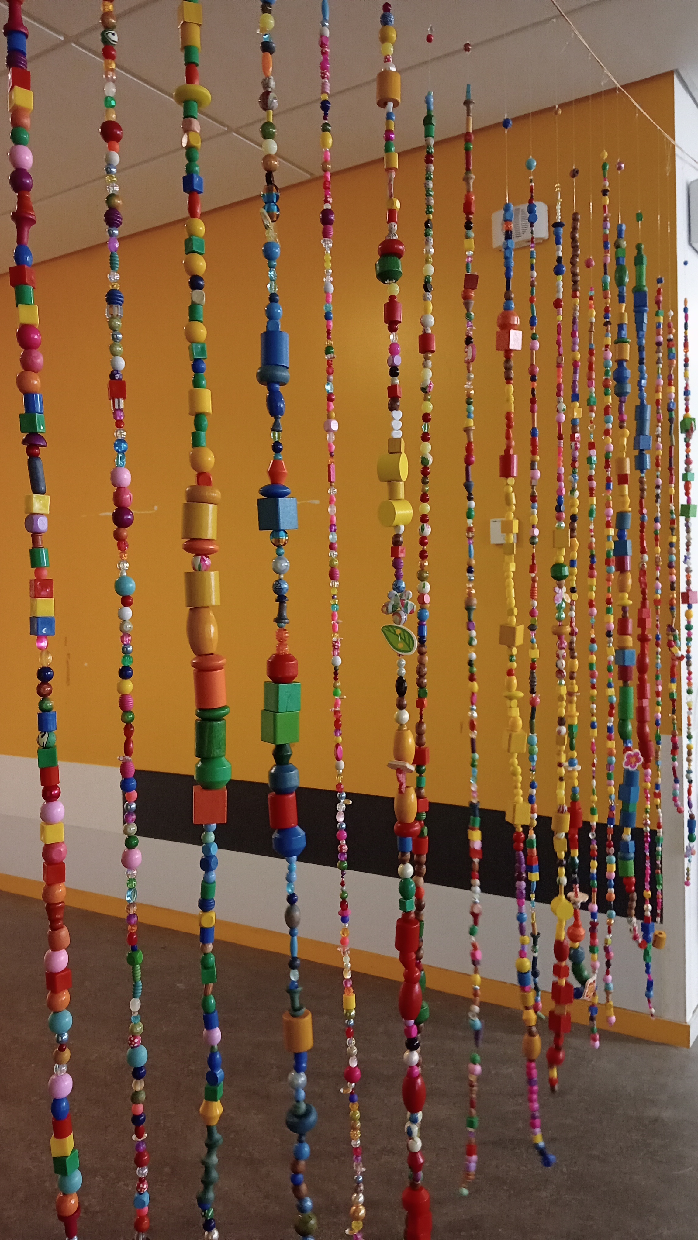 2 classes ont construit un rideau de perle, une première étape de tris à permis de regarder toutes les perles pour ensuite les choisir avec soins et composer chacun un "brin" qui formera le rideau final.