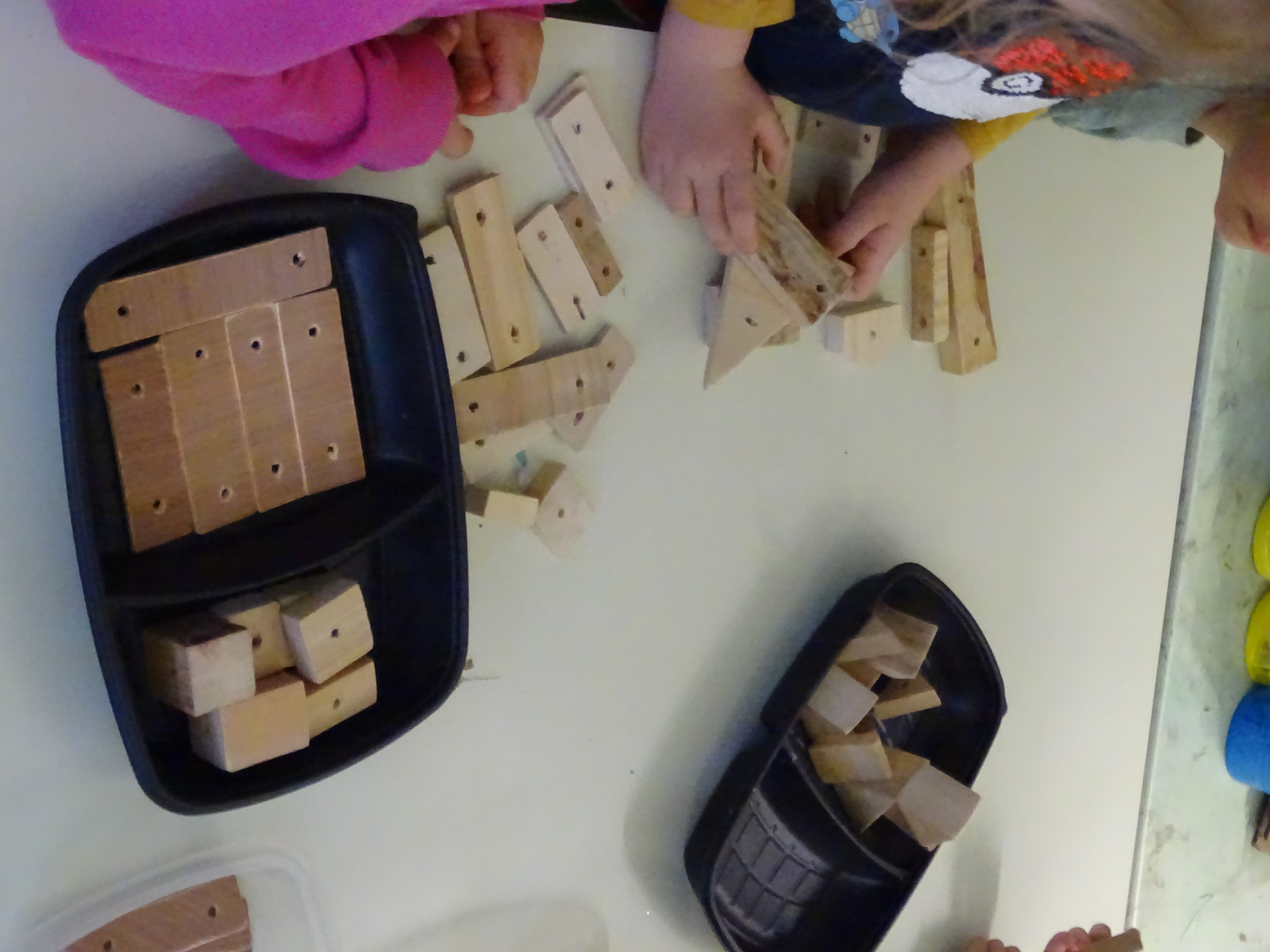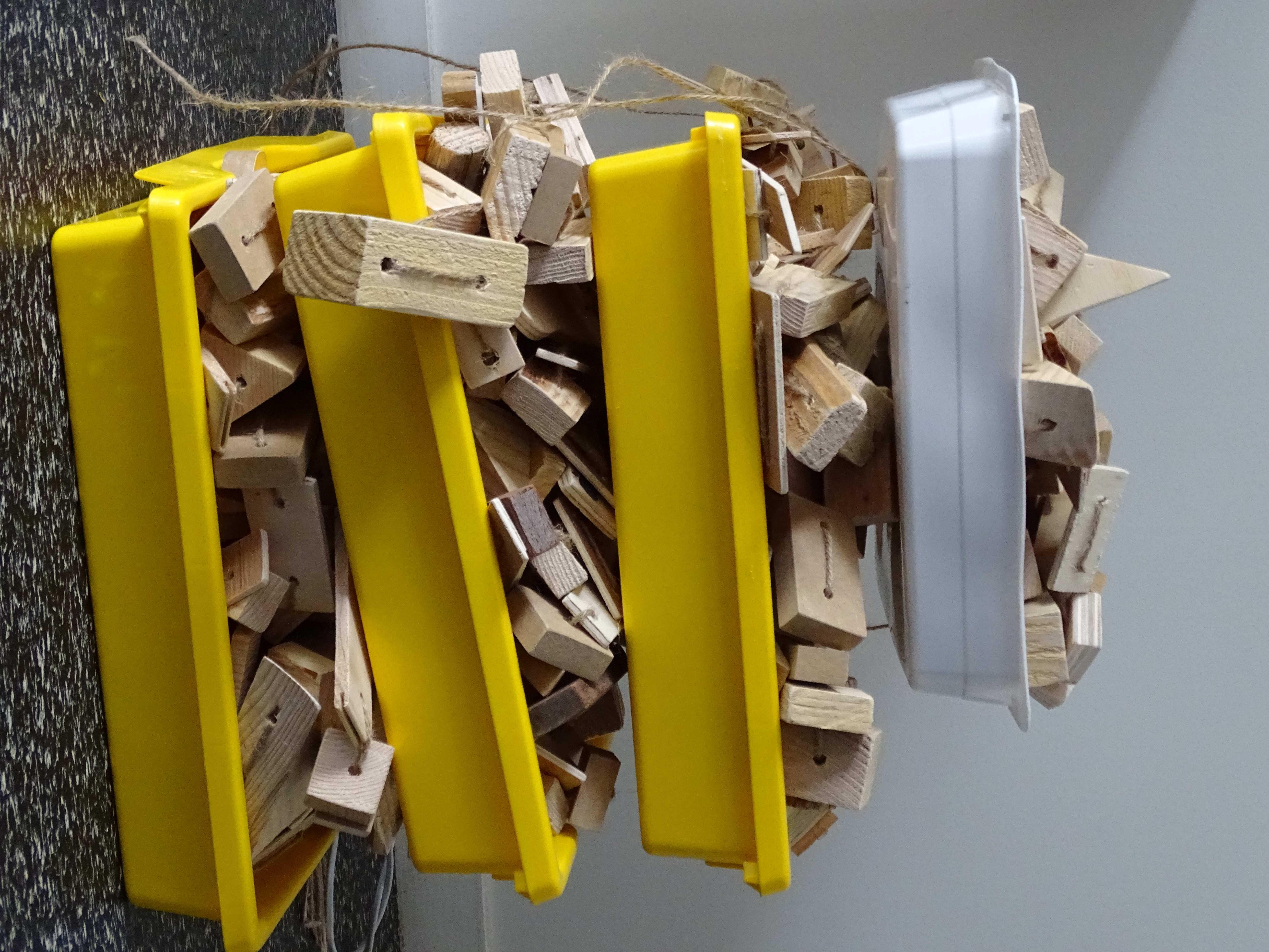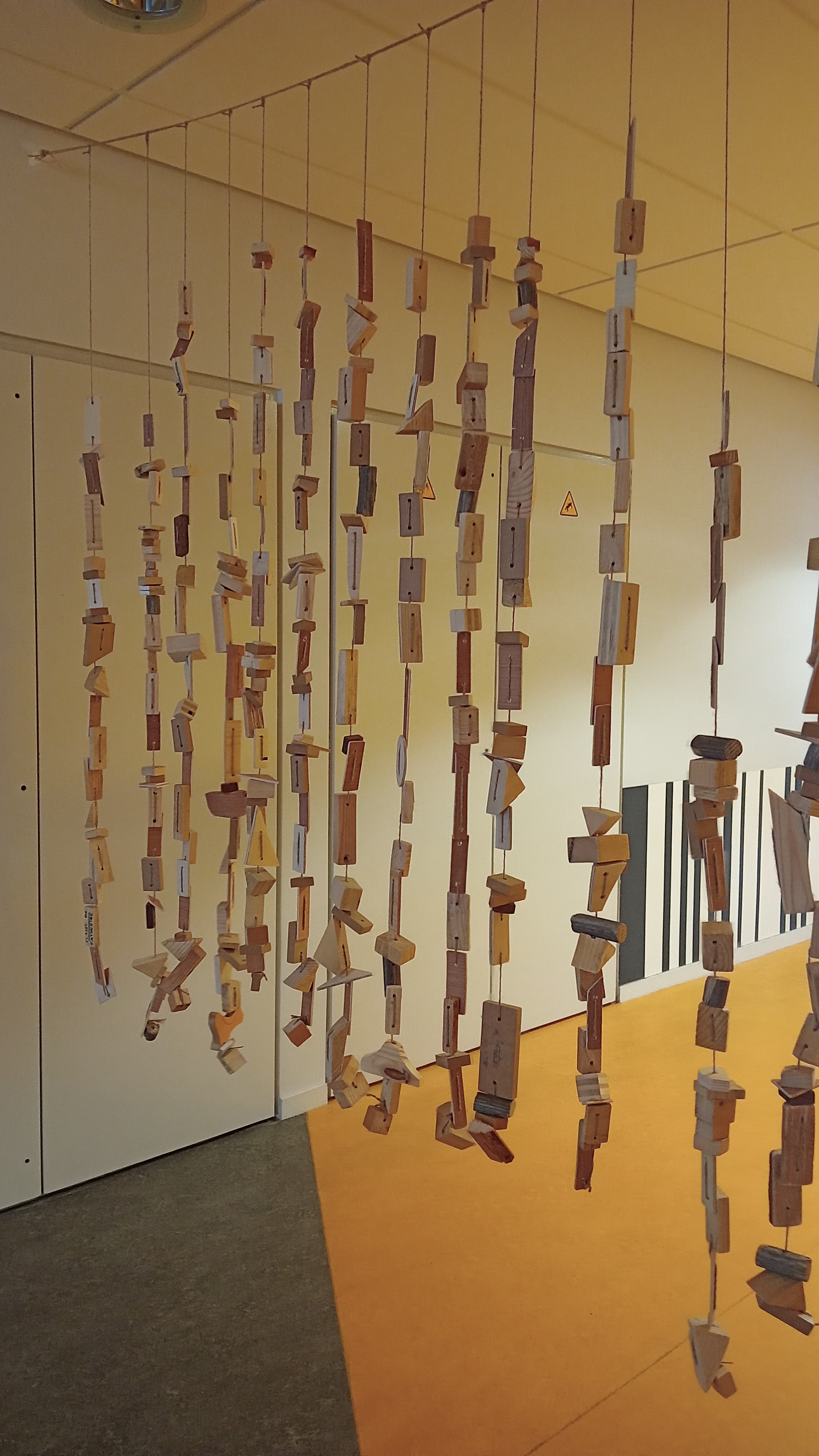 2 classes ont participer aux rideaux de bois, chaque enfants à pu constituer 1 brin qui formera ensuite le rideaux .