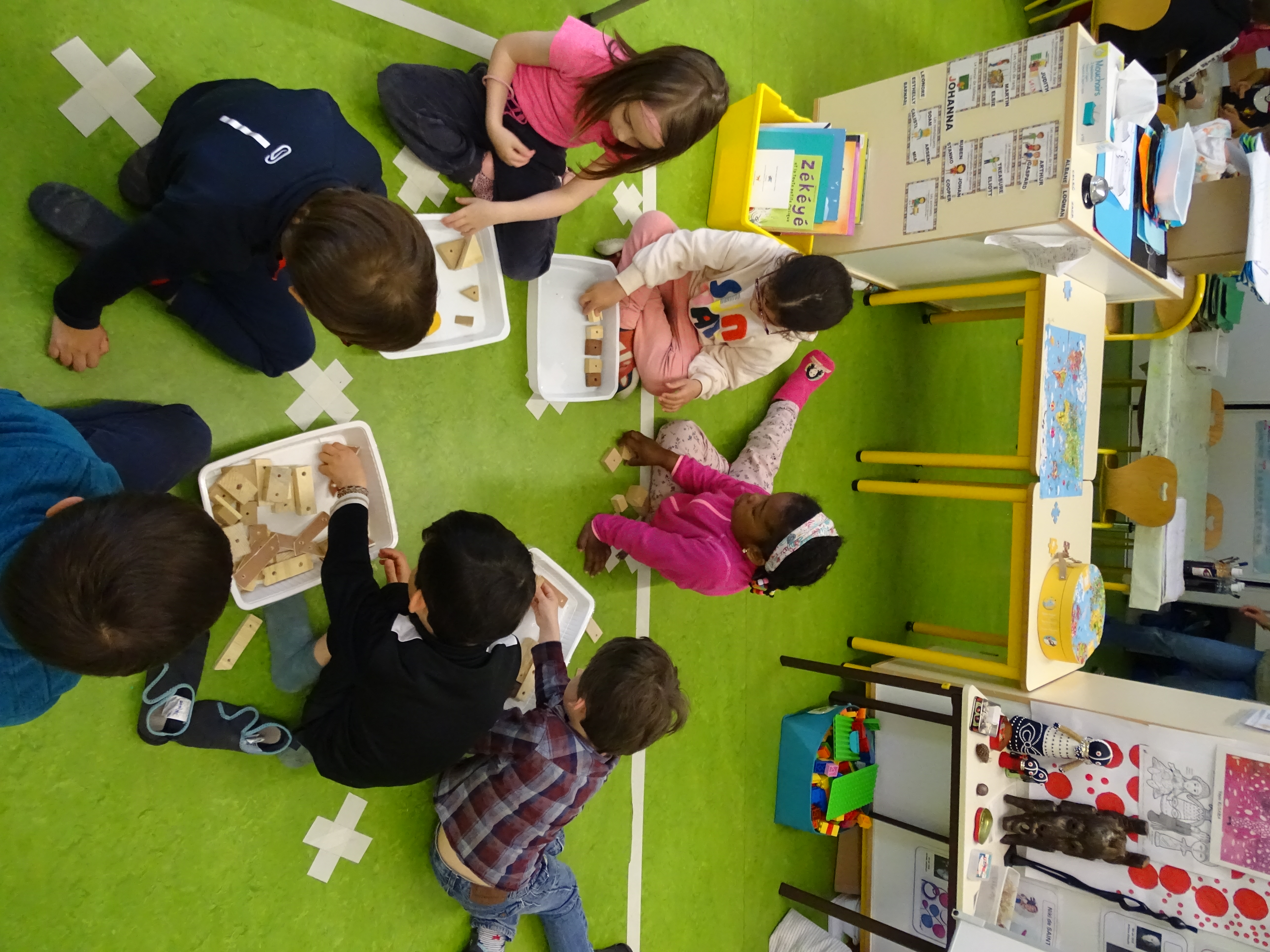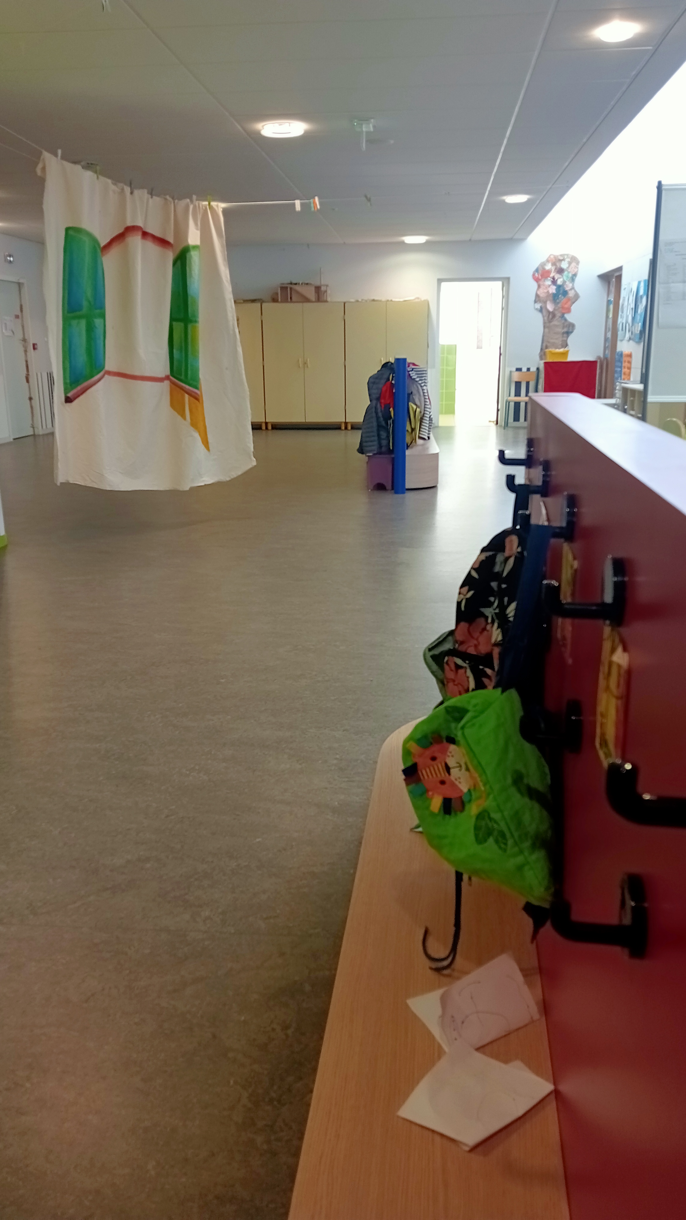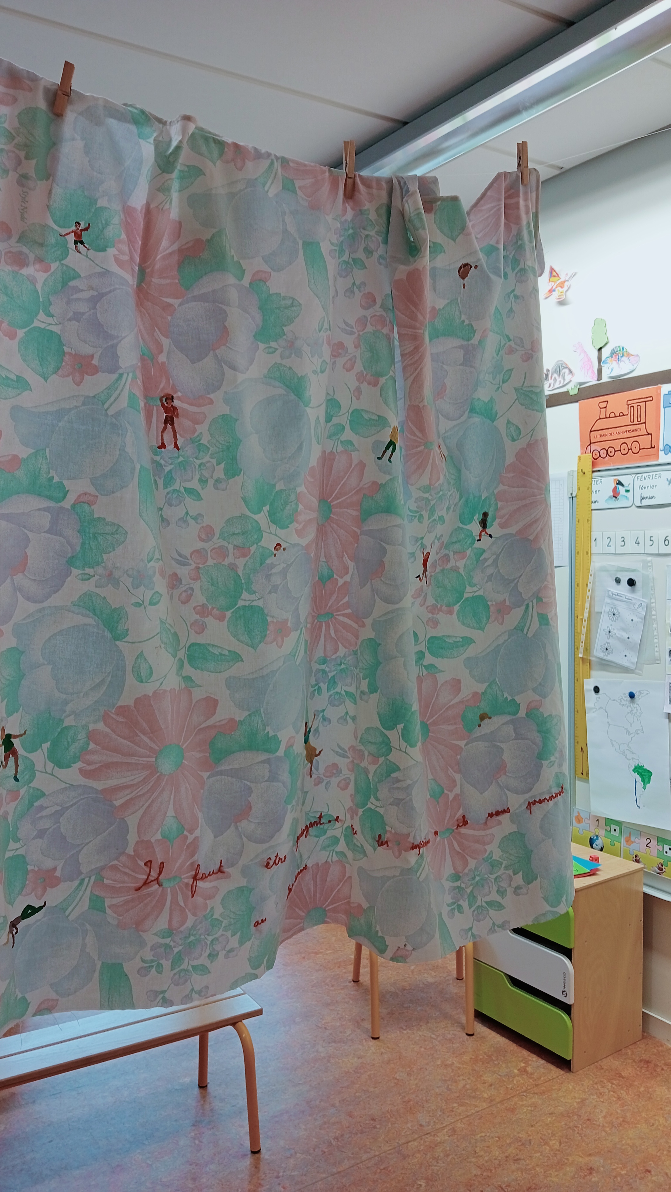 Lors de l'intervntion "Traverser les temps" dans 6 classes de maternelle les enfants découvrais le matin dans leurs salle de classe habituels quelques rideaux curieux suspendu qui ont ensuite permis d'ouvrir une discution autour de ce qui serais l'objet de notre découverte : les rideaux leurs utilité et toutes leurs particularités.