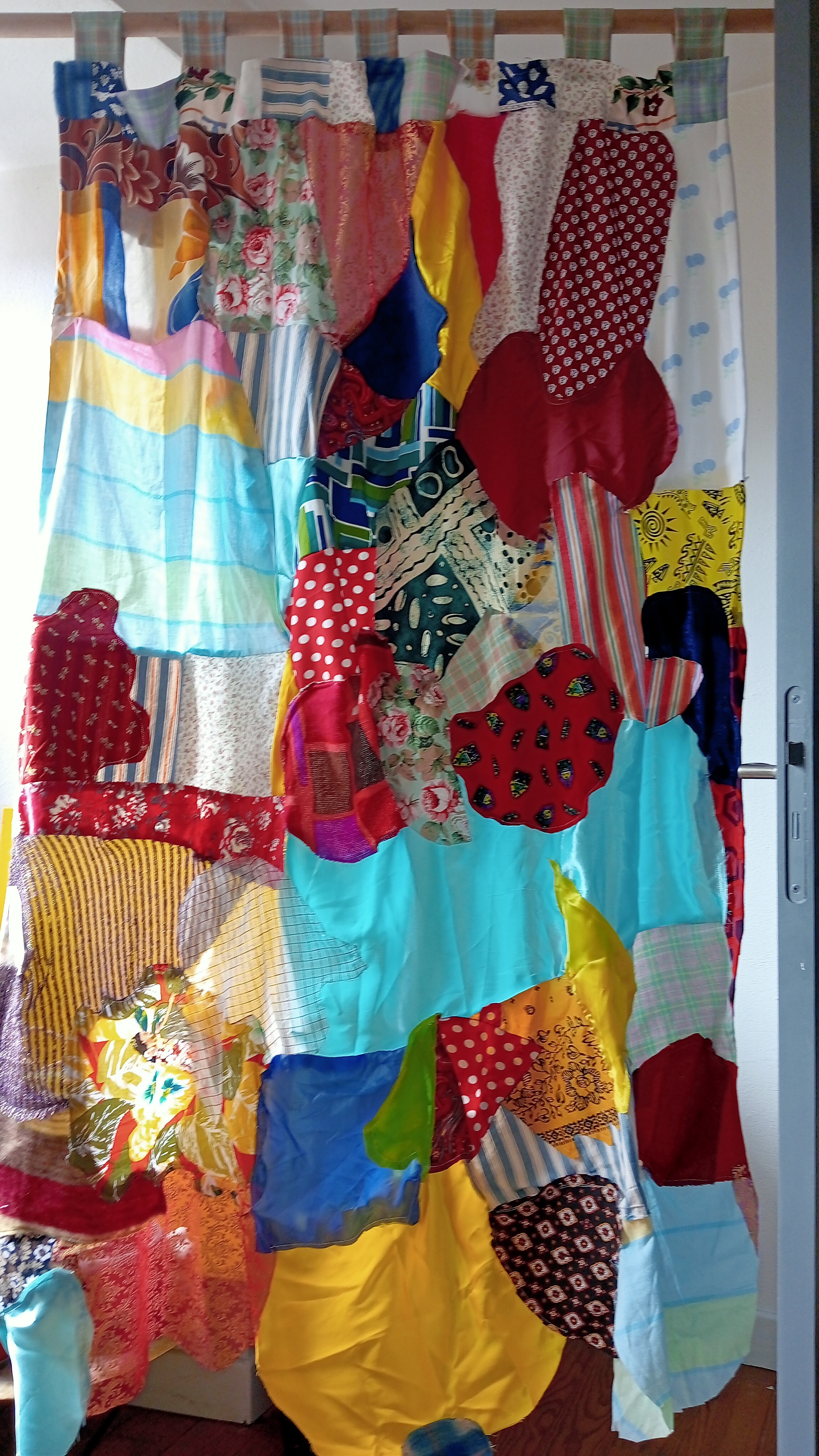 2 classes ont fabriquer le rideaux de tissus, chacune un pan; pour cela les enfants ont d'abord choisis fabriques des formes puis ont choisis des tissus et ont découper leurs formes dedant.
