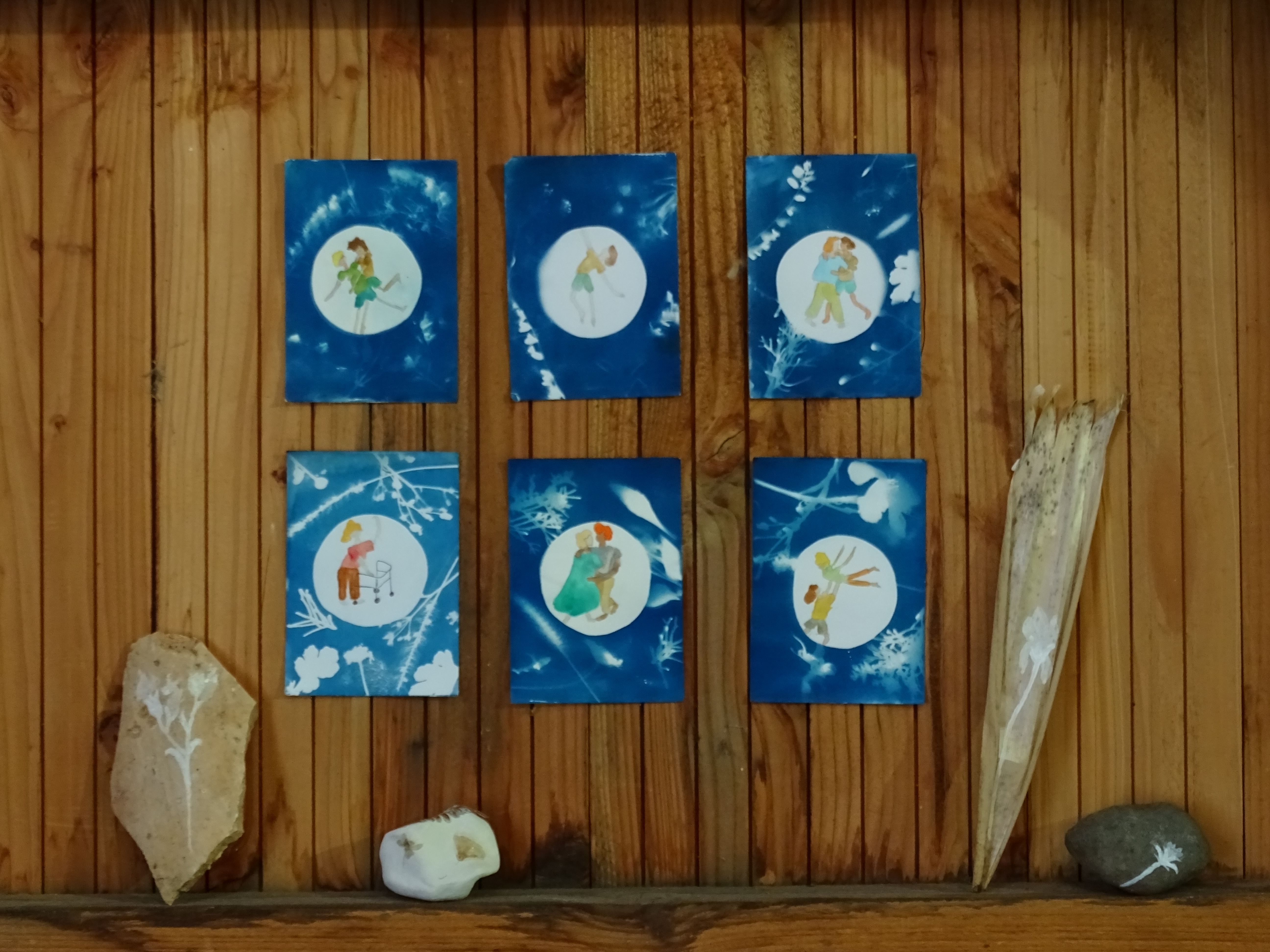 Série de 25 cyanotypes et aquarelle, 12x7,5 cm Photo lors de l'exposition Souvenir d'été, 2024