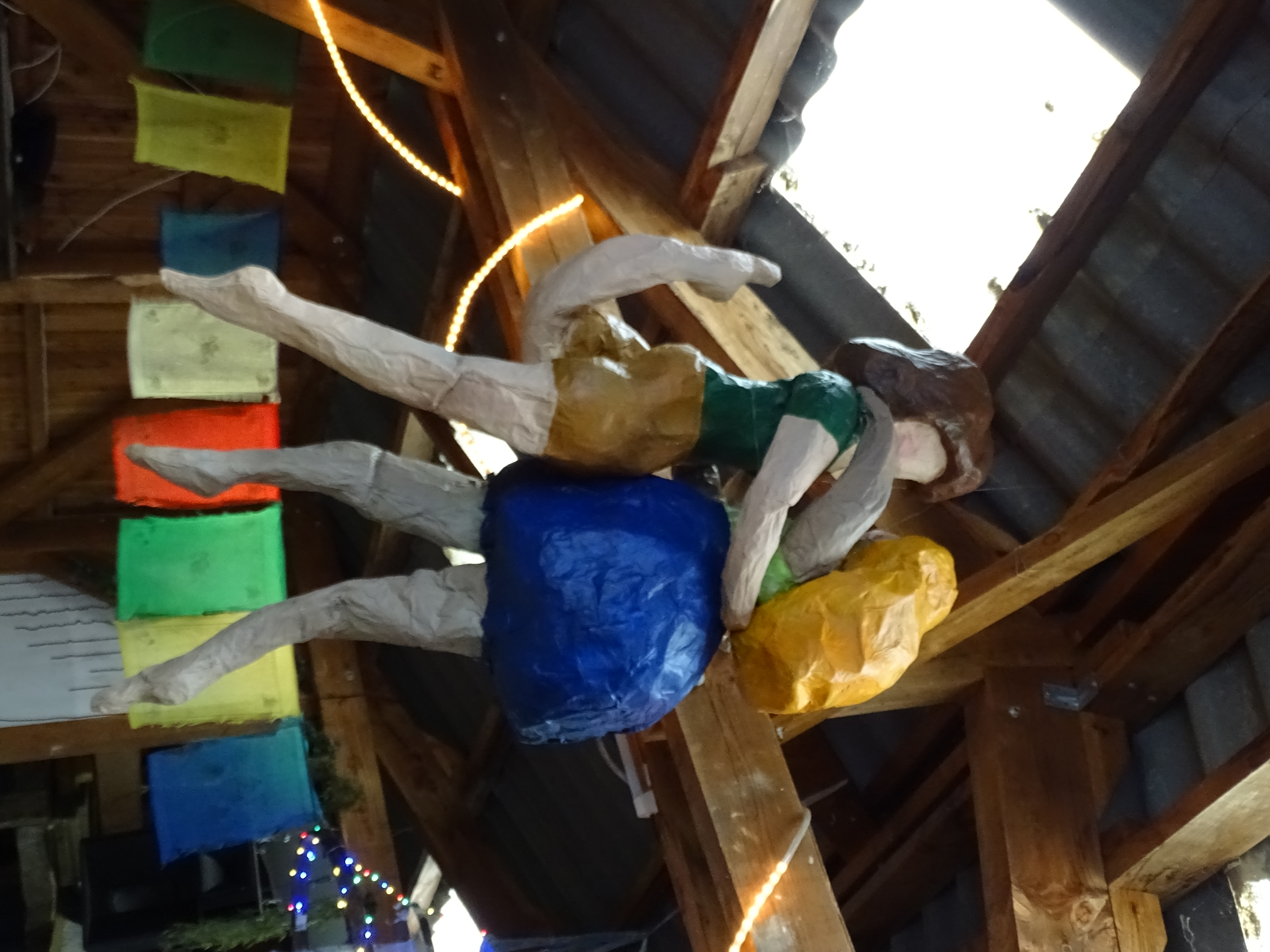 Danseur et danseuse en papier mâcher, 150 cm Photo lors de l'exposition Souvenirs d'été à LaGrange à Burzet, tiers lieux de l'ardèche sociale club, septembre-octobre 2024.